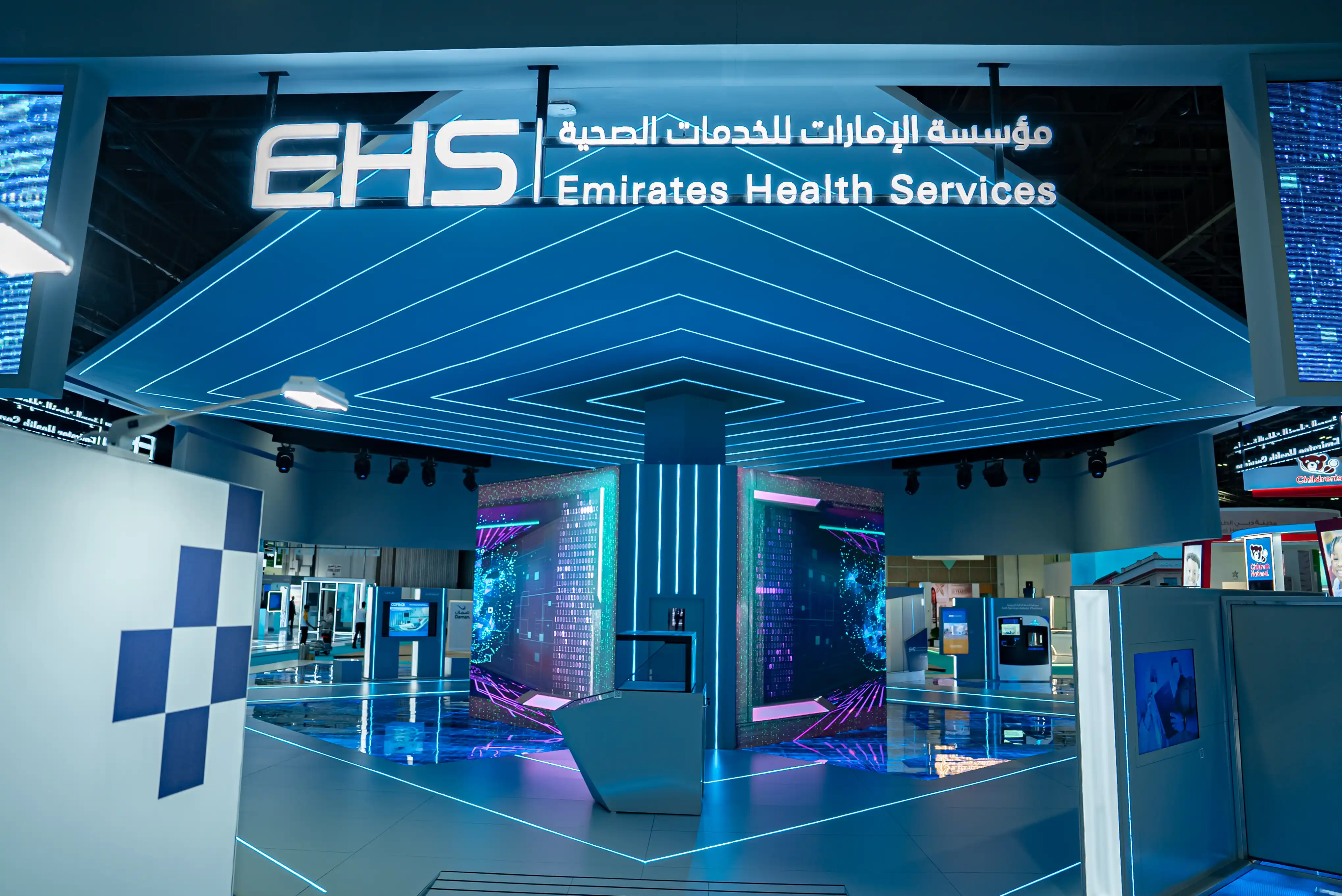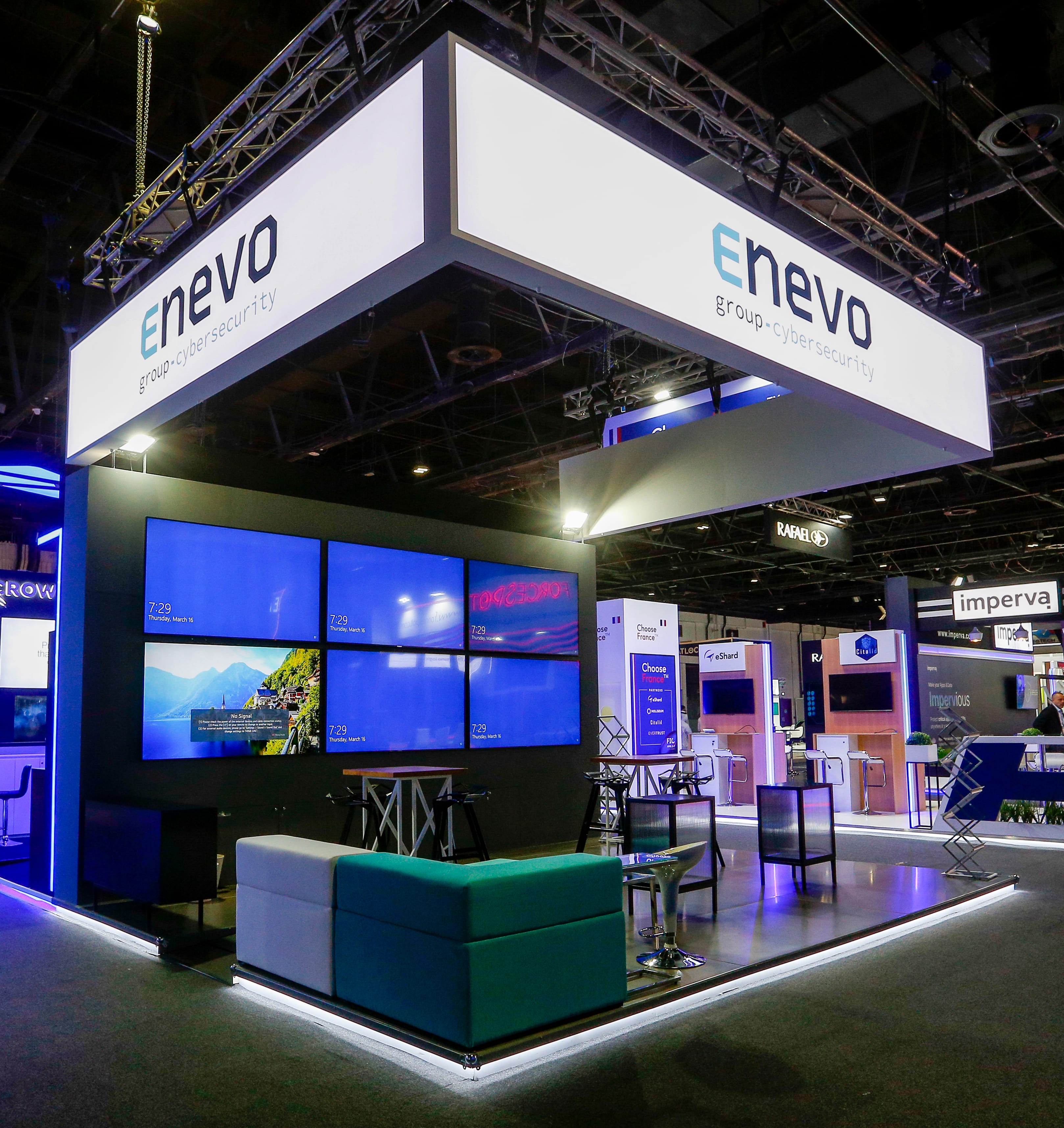 Stand built with a high-tech, futuristic theme Multiple screens displaying dynamic content