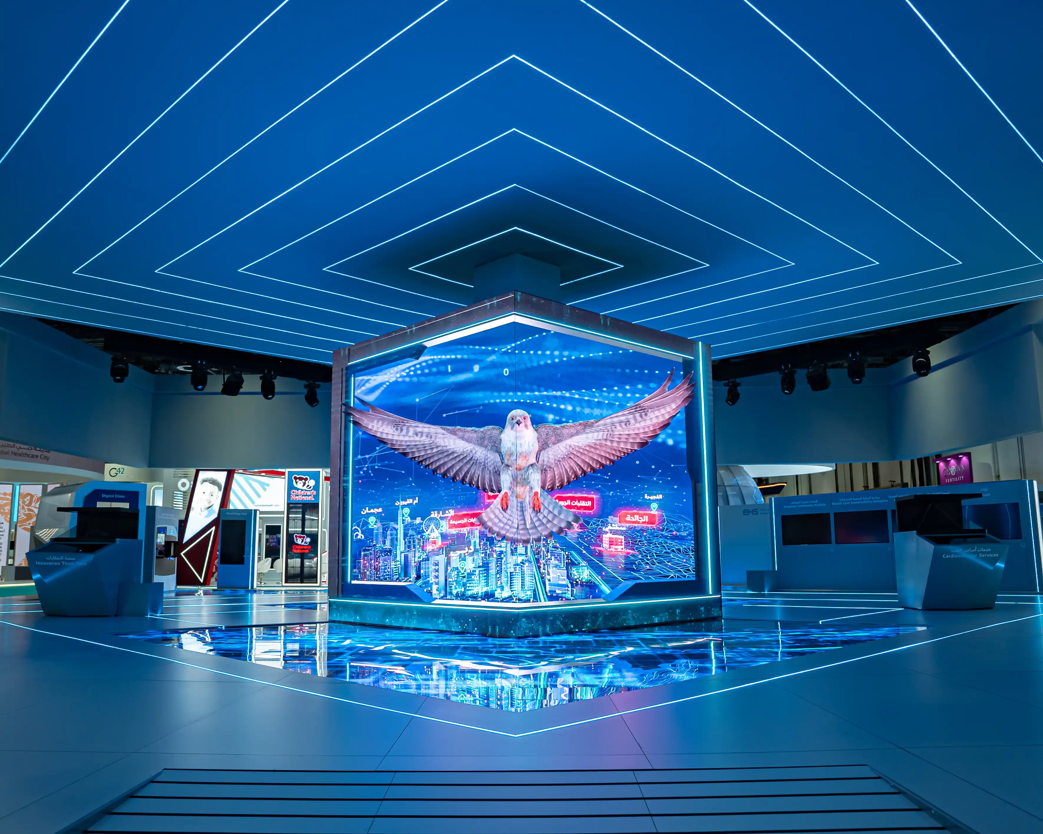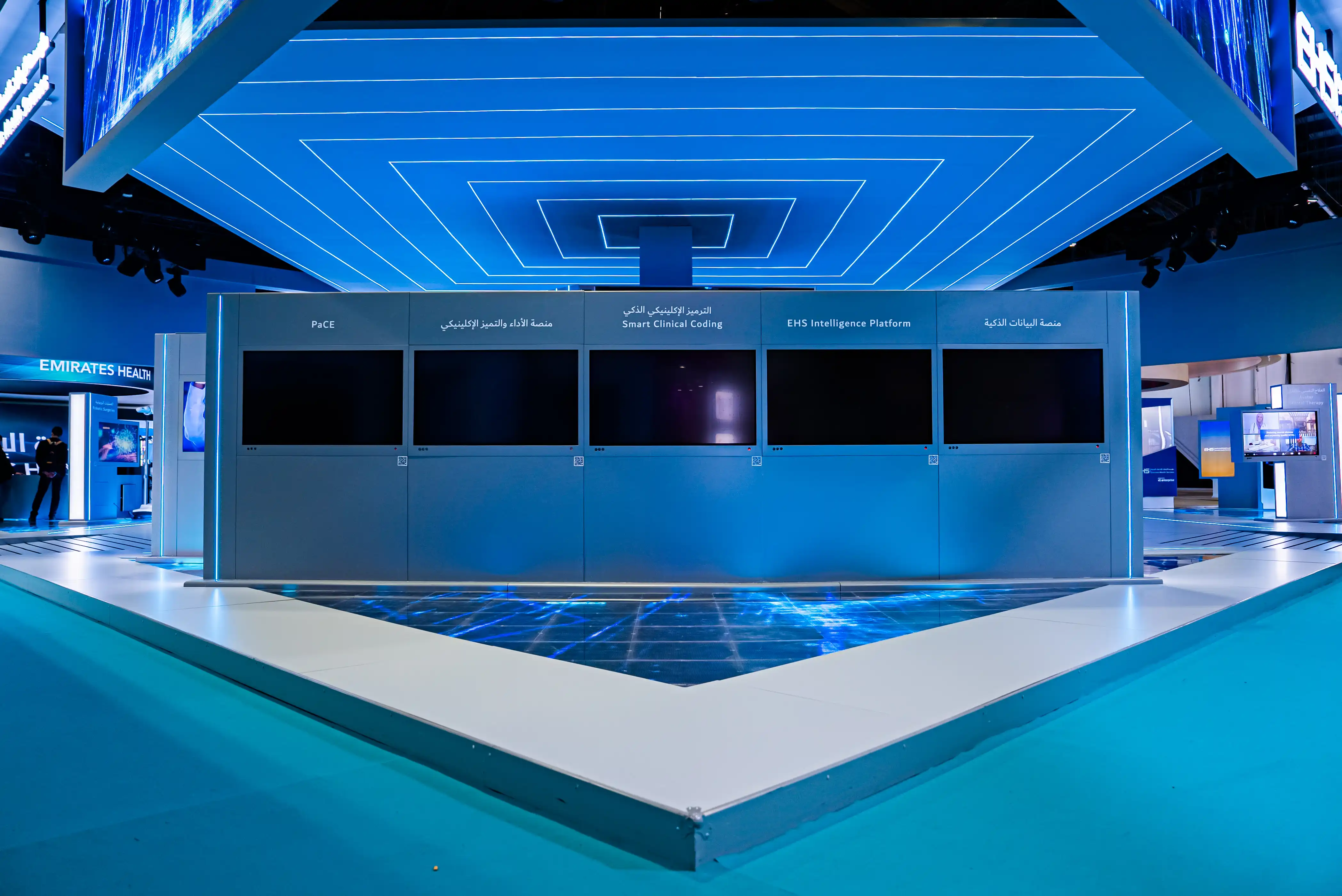 For the event in question, we aimed to showcase our expertise in merging creative design with the latest technology, achieving a high-tech futuristic presence. Our goal was to present creative content in an innovative manner, which we accomplished by utilising high-tech futuristic stands coupled with flexible screens.